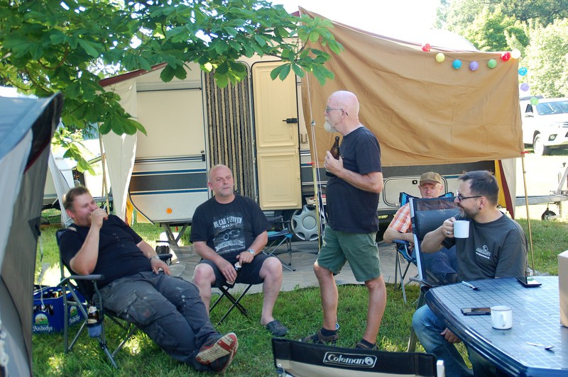 Nach ein paar Stunden haben wir so ziemlich alles gesehen, sind bei manchen Ständen länger hängengeblieben, andere haben wir im Schnelldurchgang gemacht, alles interessiert einen ja auch nicht. Wir fahren wieder zurück ins Camp, dort sind bereits wieder einige angekommen – der Kreis wird größer! Wie auch die Jahre zuvor gibt´s abends wieder Thüringer Bratwürste, frisch vom Metzger und vom Cheffe persönlich gegrillt – immer wieder ein Leckerbissen! Danach trifft man sich am Lagerfeuer oder sitzt in kleinen Gruppen zusammen. Es wird dann doch wieder recht spät…