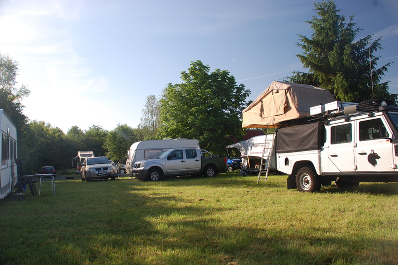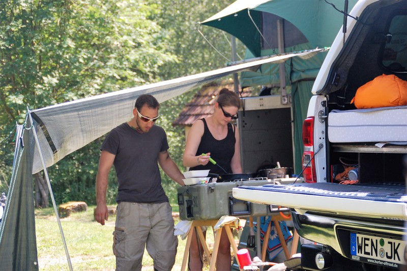 Bei herrlichem Wetter sitzen wir lange draußen, Ronny fährt mit ein paar Helfern ins Dorf und holt das wichtigste Utensil für´s Treffen: den großen Getränkekühlschrank. Den befüllen wir gleich, denn warmes Bier ist ja auch nicht so das Wahre… Nach einer ruhigen Nacht und einem Frühstück in der Sonne verbringen wir einen lustigen Tag mit unseren Freunden. Alain und Katarina kommen mit ihrem Ranger aus Luxemburg, Daniel und Melli ebenfalls mit Ford aus der Eifel. Andere trudeln im Laufe des Tages ein, bis abend ist das Camp für einen Donnerstag schon erstaunlich gut gefüllt. Und es gibt Thüringer Brotzeit, sehr lecker! Am Abend brennt das Lagerfeuer, der Bier-Kühlschrank ist dank edler Gerstensaft-Spenden gut gefüllt, man kann sich quasi durch alle Regionen trinken!