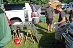 Am Samstag ist es leider windig und um etliches kälter geworden, so daß wir die kurzen Hosen und die Flipflops gegen längere Beinkleider tauschen und doch das Softshelljäckchen auspacken. Aber davon lassen wir uns die Laune nicht verderben und verbringen einen schönen Tag im Camp mit guten Gesprächen, die sich nicht immer nur um die Geländwagen drehen. Andi und Maike haben wieder die Hufeisen mitgebracht, wer mag, kann sein Können in dieser Sportart testen! Irgendwann am Nachmittag startet dann die Vorbereitung fürs Abendessen, und das wird vom hiesigen Pfarrer zubereitet! Es gibt Fleisch aus dem Smoker, nach drei Stunden leckerem Duft, der über das Lager weht, ist es endlich so weit – es heißt anstellen! Aber es ist genug für alle da, dazu Brot und Salate… ein echtes Highlight! Da stört dann auch der ganz leichte Nieselregen nicht. Am Abend wird noch mal kräftig gefeiert, da sind nachts dann schon Ohrstöpsel empfehlenswert!
