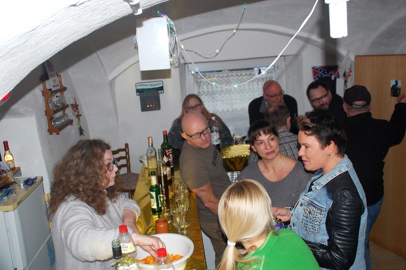 Am Samstag sah es wettertechnisch ganz gut aus, so daß der Rest nach dem Frühstück einen Spaziergang machte, während ich gleich unseren „Saustall“ vorheizte, damit es bis Nachmittag dann schön warm war! Die Sonne schien, Flo und Natascha kamen mit der Wohnkabine auf dem Isuzu, und nach und nach dann auch noch einige andere, die von Faschingsumzügen auch nicht so viel hielten… Wir konnten einige Zeit draußen sitzen bei recht angenehmen Temperaturen, erst als die Sonne hinter der Scheune verschwand, wurde es zu kalt. Schnell füllte sich unser Saustall, die Bar war wieder ein beliebter Treffpunkt und ganz schön voll! Claus führte Alain und Katarina noch sein Dachzelt zum probeliegen vor.