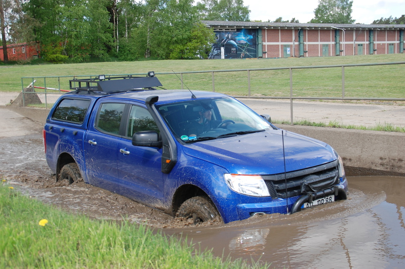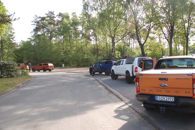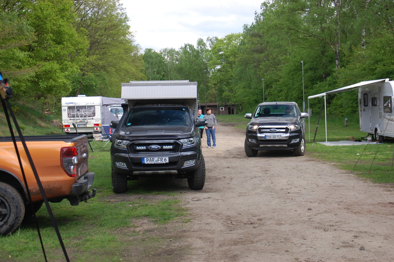 Am Mittwoch Morgen geht´s los Richtung Norden, hinter mir Dave und Flo, die mit dem Transporter folgen. Weit kommen wir nicht, gleich hinter Bayreuth stehen wir erst mal fast eine Stunde in einer Vollsperrung! Da kommt Freude auf – wir lassen uns die Stimmung aber nicht vermiesen, ich rufe Claus an, der mit Flo aus Richtung Regensburg kommt und wir unseren vereinbarten Treffpunkt viel zu spät erreichen würden. Sie fahren dann weiter, auch bei uns geht´s irgendwann wieder weiter, ein Bieranhänger hatte gebrannt. Da sitzt wohl nun einer auf einem Fest auf dem trockenen…. Die restliche Strecke der 590 km kommen wir gut voran und erreichen den Fursten Forest am Nachmittag. Nachdem man uns an der Rezeption erst mal um einiges an Kohle erleichtert, erreichen wir unser Camp. Wir haben eine der beiden Schießbahnen reserviert, und die ersten sind wir nicht. Die Wiedersehensfreude ist groß, zu unserer Verwunderung sind Claus und Tobi noch nicht da. Die kommen dann kurz drauf, haben den Verlust unseres Staus mit einem kleinen Umweg über Hannover ausgeglichen – so kommen wir trotzdem fast zeitgleich an! Der Respekt geht dabei an Tobi, der mit Umweg die über 700 km mit einem Suzuki Jimny abgerissen hat! Für Alain und Katarina war es das erste Campingwochenende mit Wohnwagen, für Markus die ersten Campingtage und auch die erste Offroad-Erfahrung für ihn und seinen Ranger.