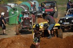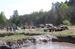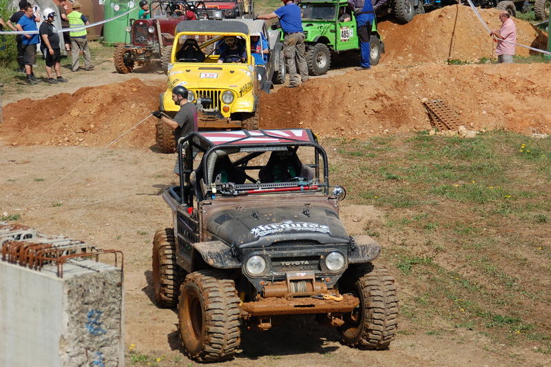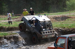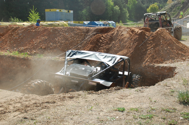 Um 10 Uhr nach dem Start dann eine Staubwolke, das erste Hindernis in Form eines tiefen, senkrechten Grabens ließ nicht lange auf sich warten! Trotz mehr als ausreichend Leistung und riesigen Stollenreifen keine leichte Aufgabe, es kam schon zu Staus. Ein Rundkurs mußte auf Zeit befahren werden mit Kontrollpunkten an verschiedenen Stellen, von Steilauffahrten über Verschränkungen und Wasserlöchern war alles dabei, von festem Untergrund bis zu losem Bauschutt ebenso. Alle gaben ihr bestes, einige Ausfälle gab es trotzdem zu beklagen. Beeindruckend immer wieder die Leistung Teilnehmerfahrzeuge! Der Steilhang wirklich steil und lang, und doch meinte man bei manchen, sie flögen hinauf! Umfaller gab es natürlich auch, gehört ja dazu.