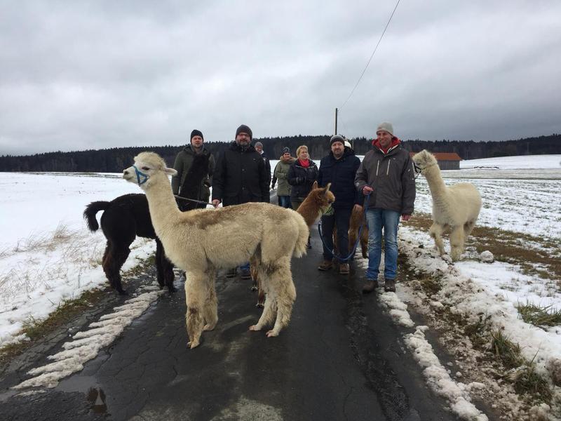 Am ersten Sonntag im neuen Jahr an Hl. Drei König war es soweit. Wahrscheinlich waren wir das Dorfgespräch im kleinen Dörfchen Gaisheim unweit Moosbach, so viele Geländewagen rollen dort wohl eher selten durch. Alain und Katarina waren auf dem Weg zurück von der Slowakei nach Luxemburg und da passte der Zwischenstopp ganz gut. Jeder fand einen Parkplatz am Anwesen von Martin und Petra, und da das Wetter auch durchhielt, wollten wir auch gleich los. Mit 5 der insgesamt 12 Alpakas marschierten wir los. Dabei legten die Tiere ein ganz schönes Tempo vor, bedingt durch den nassen Schnee kamen wir doch ganz schön ins Schwitzen! An einer Lichtung wollten wir ein Gruppenfoto machen, was aber gar nicht so leicht war, da die Tiere es vorzogen, eher in unsere Richtung als in Richtung der Kamera zu schauen. Das war die Stunde des kleinen Pommes: Der 3-kg-Chihuahua von Claus und Sabrina zog sofort die Aufmerksamkeit auf sich und jetzt schauten alle in die Kamera! Nach einer Dreiviertelstunde waren wir wieder zurück am Konradenhof, wo wir von den restlichen Alpakas neugierig beäugt wurden. Überhaupt scheinen sie sehr neugierig zu sein, oder vielleicht auch nur wachsam?