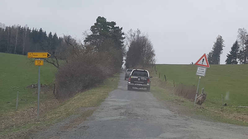 Wir verabschieden uns von Stefan und Jeannette und Holger und Carola, die auf dem direkten Weg wieder nach Hause fahren. Wir haben Zeit und Markus sucht wieder ein paar Nebensträßchen. In einem kleinen Dorf biegt er plötzlich ab, eine Wasserdurchfahrt neben einer Brücke zieht uns magisch an. Allrad rein und durch! Bei einer Tiefe von ca. einem halbem Meter ist das für die Fahrzeuge kein Problem. Leider ereilt mich auch das Schicksal der „Nummernschildverlierer“! Auf dem Video, das Jenny gefilmt hat, sieht man, wo das Nummernschild aufgrund der kleinen Bugwelle wegfliegt! Und in den Fluten untergeht! Wir machen uns sofort auf die Suche, aber das Wasser ist zu trüb und die Strömung zu stark, als daß es liegenbleiben würde! Ich sehe mich schon mit neuer Zulassung rumfahren!