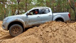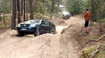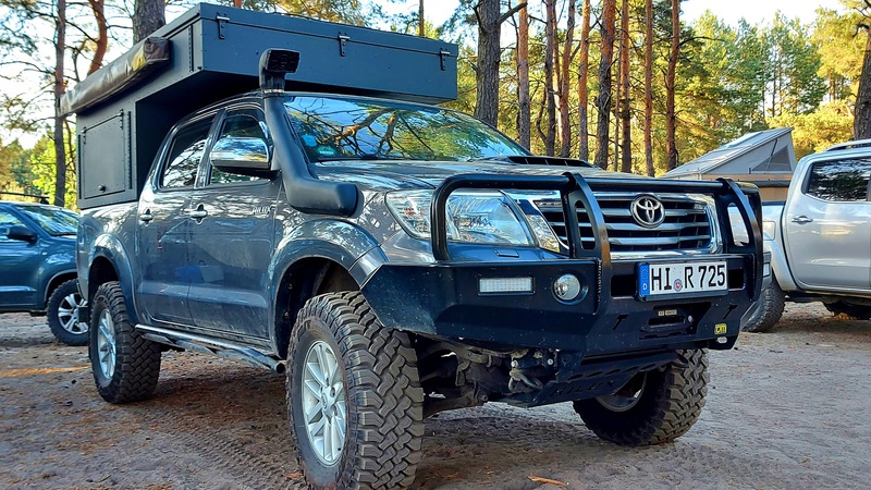 So ist es ein interessanter Weg mit ständigem Auf und Ab, bis man in einer großen Sandgrube ankommt. Hier sind ein paar Sektionen dabei, die wir mit den Pickups nicht schaffen, was aber Leute wie Daniel nicht dran hindert, es trotzdem zu versuchen! Aufgegeben wird nicht, irgendwann ist der Sand platt gewalzt und der alte Hilux packt es! Stefan hat mit seinem Bus in dem losen Sand weniger Glück und fährt sich so fest, dass es schon eine zeitlang dauert, bis er wieder flott ist! Auch einige andere werden mutiger und gehen verschiedene Sektionen an, zum Spaß der Zuschauer auf dem Hügel! Nachmittag fahren wir zurück ins Camp und sind begeistert über die Vielseitigkeit des Offroadparks! Daniel meistert auch die Wasserdurchfahrt, die doch tiefer ist als gedacht, was mit einer Trocknung des Hilux endet. Abend wird gegrillt, nun sind auch die letzten unserer Freunde angekommen.
