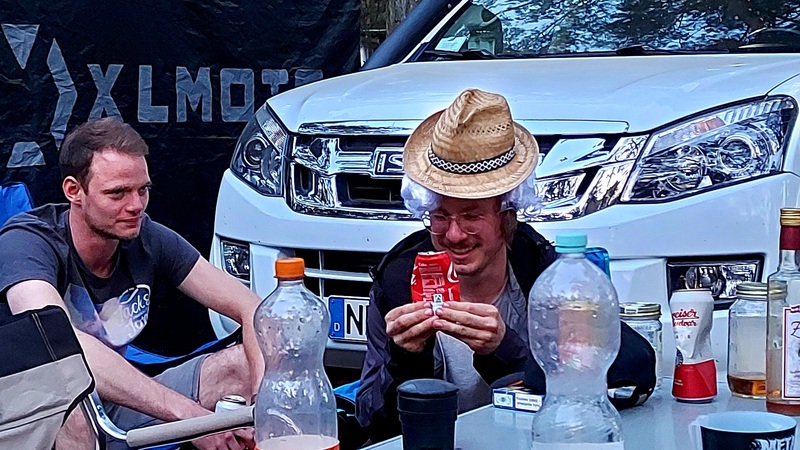 Um 8 Uhr treffen wir uns mit 13 Fahrzeugen an der Tanke in Windischeschenbach und fahren dann im Konvoi über Dresden und Cottbus bis nach Jänschwalde. Bei bestem Wetter checken wir ein und bauen gleich unser Camp aus. Mit 95 Euro für 3 Tage campen und 2 Tage Offroaden ist der Preis echt nicht überzogen und völlig akzeptabel. Platz ist echt genügend, das Wetter angenehm warm. Man steht schön unter schattigen Bäumen, durch die Trockenheit staubt es zwar sehr, aber das soll uns egal sein. Lagerfeuer ist leider aufgrund der hohen Waldbrandgefahr nicht erlaubt. So sitzen wir gemütlich zusammen, so nach und nach werden es mehr.