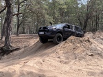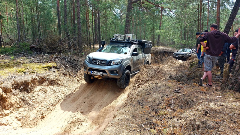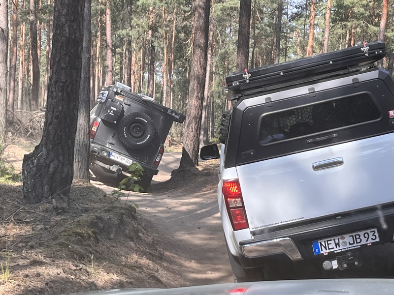 Gegen Abend laufen wir mal zu Fuß durch das weitläufige Gelände, das unterteilt ist in eine rote Strecke und eine blaue. Erstere ist die leichte, letztere die schwerere Strecke. Nach einer ruhigen Nacht und einem gemeinsamen Frühstück am Morgen kann es dann am Vormittag losgehen! Unser Konvoi nimmt zuerst die leichtere Strecke in Angriff, außer ein paar Schräglagen, bei denen man wegen Bäumen in Kurven etwas aufpassen muss, ist die leicht zu befahren. Als wir damit durch sind, wollen wir uns mal an die schwerere Strecke wagen. Auch die verläuft mitten durch den Wald, alles ist trocken und sandig. Wir krabbeln von einem Hügel zum nächsten, kommen alle gut durch. Wie es aussieht, wird die Strecke ständig neu präpariert, klasse! Mancher nicht höhergelegte Pickup kommt auf den spitzen Kuppen an seine Grenzen, aber es ist immer jemand da, der einen wieder flott bekommt! Dabei mal ein besonderer Dank an unsere „Berge-Queen“ Milena und Tim und ihren Jeep Wrangler, die jeden mit der Winde wieder auf den richtigen (Offroad)Pfad bringt!