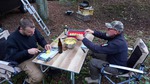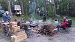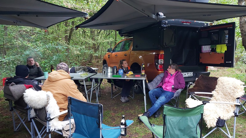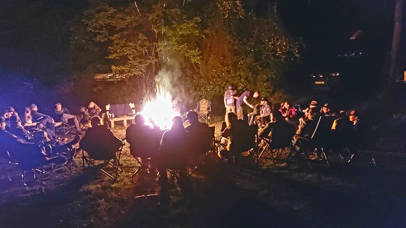 Wir finden für alle Pickups einen schönen Stellplatz in der tollen Location mitten im Wald. Ein paar waren schon da, alte Bekannte und auch neue Gesichter. Marcel, mein Mitstreiter aus unserer Hilux-Vibes-Gruppe, kommt mit seinem Hilux an, Werner ist da mit einem alten L200 und 35er Reifen, Mario und Anke hatten auch einen weiten Anreiseweg. Norbert und Diana leben ja jetzt in der Schweiz, sie bringen noch drei Freunde aus der Schweiz mit, die im Amarok und im Ranger anreisen. So vergeht der Nachmittag wie im Flug! Basti und Lena haben mich zum Essen eingeladen, es gibt Schichtfleisch. Dazu schnippeln wir fleißig, um uns dann später das hervorragende Schichtfleisch mit Bratkartoffeln schmecken zu lassen. Es wird schon dunkel, nach dem Essen haben die Jungs an der Feuerstelle schon ganze Arbeit geleistet und wir gesellen uns dazu, bis wir um Mitternacht in unsere Schlafsäcke kriechen.