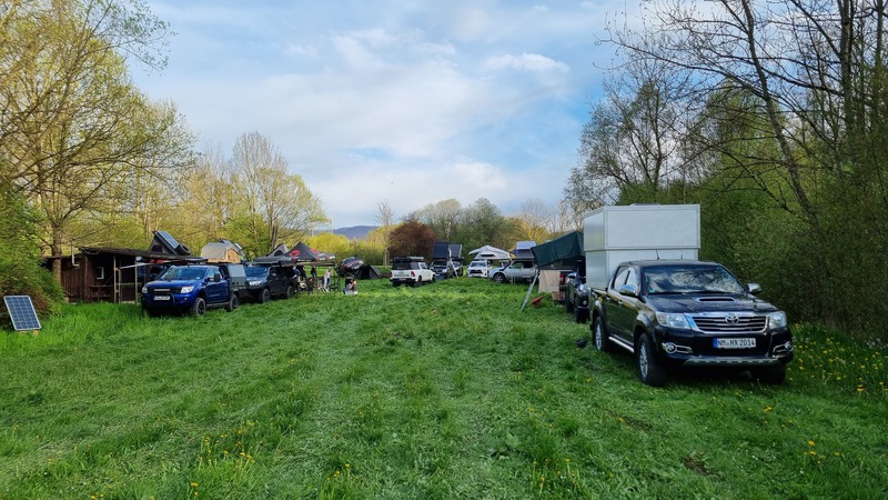 Ich schlendere durchs Camp, natürlich möchte man jeden wenigstens mal kurz kennenlernen, für stundenlange Gespräche ist das Wochenende leider zu kurz – oder die Fahrzeuge mit insgesamt 32 schon zu viel! Platz wäre noch für viele gewesen. Gegen Abend wird das Wetter leider etwas schlechter, der Regen ist jedoch minimal, das kann uns die Laune nicht verderben! Wir grillen, sitzen am Feuer und schneller als gedacht ist es weit nach Mitternacht, bis wir in unsere Betten kriechen! Nachts regnet es, aber zum Frühstück sitzen wir wieder draußen. Nach dem Frühstück heißt es wie immer aufräumen, verabschieden und sich auf den Heimweg machen, viel zu schnell ist so ein Wochenende, auf das man sich schon lange im Vorfeld gefreut hat, vorbei! Ich fahre gemeinsam mit Max und Tommy los, ohne Stau erreichen wir stressfrei wieder unsere heimatliche Oberpfalz.