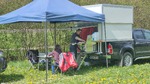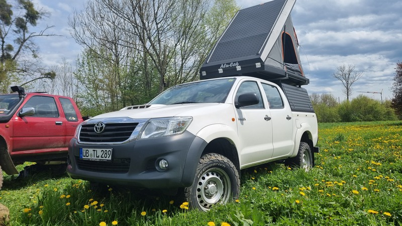 Bei bestem Wetter bin ich also am Freitag Vormittag mit vollgepacktem Hilux von Weiden aus gestartet, über Nürnberg, Heilbronn und Stuttgart erreiche ich ohne Stau Nürtingen – und finde nach einigem Suchen, bei der mich mein Hilux-Navi kläglich im Stich lässt, endlich den Veranstaltungsort bei herrlichem Sonnenschein. Lange bin ich nicht alleine, da kommt auch schon Mirko gefahren, kurz darauf Marvin und Marvin und Marei, die aus dem Ruhrgebiet hierher gekommen ist. Wir suchen uns auf der großen Wiese ein schönes Plätzchen, bauen den Pavillon auf und sitzen gemütlich in der Sonne. Joachim kommt kurz darauf, er zeigt uns den Platz und etwas später rollen auch schon die ersten Pickups aufs Gelände. Überwiegend natürlich Toyotas, aber auch Ranger und Navara´s finden den Weg zu uns!