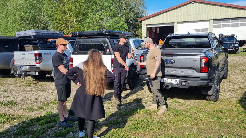 Die Arbeit im Vorfeld war bereits erledigt, als wir Mittags bei der Halle eintrudelten. Die Sau drehte sich bereits am Spieß, das Wetter wurde im Laufe des Nachmittags auch immer besser, perfekt! So nach und nach trudelten immer mehr unserer 4Wheelers ein, dazu noch ein paar befreundete Geländewagenfahrer, so dass wir letztlich die Campingwiese hinter der Halle mit 25 Fahrzeugen belegten! Ein toller Anblick, so viele 4x4 und Pickups auf einen Haufen! Hiluxe, Ranger, Navaras, Jeeps, Dodge…. Ronny holte sogar seine Schätze aus der Garage in Form eines Chevy s10 und einem 87er Patrol im fast neuwertigen Zustand, heutzutage schon wirkliche Raritäten!