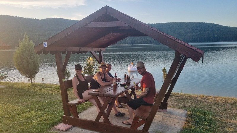Es geht weiter zum Stausee Lacul Cincis. Ein Camp Resort direkt am See sieht einladend aus, wir stellen uns dort auf die Campingwiese. Bei 34 Grad sind wir froh, mangels Bäumen die Markisen von Markus und Max zu haben! Ein Bad im angenehm warmen See sorgt für Abkühlung, gegen Abend wird es erträglicher. Es stehen überall am Platz überdachte Bänke. Wir holen uns ein Bier und sitzen am See, schöner Platz. Duschen sind vorhanden, sogar ein Pool. Trotzdem kann man hier keine Bestnoten vergeben, die Abflüsse der Duschen im Freien (andere gibt es nicht) sind verstopft, sieht nicht besonders einladend aus.