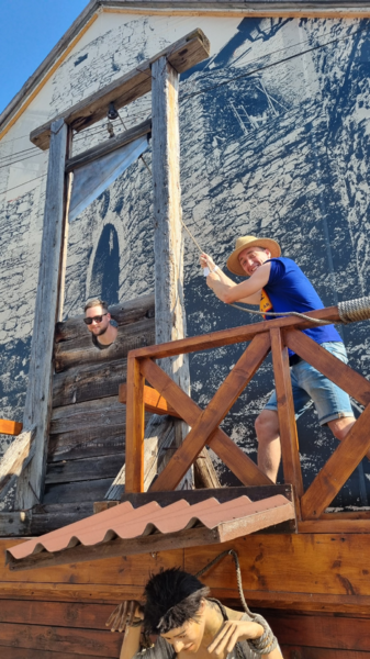 Am Sonntag geht es weiter durch das größtenteils recht flache Ungarn bis zur rumänischen Grenze, die Strecke zieht sich schon ganz schön, wirkliche Highlights gibt es da keine. Nach einem absolut problemlosen Grenzübertritt geht es bis zum nächsten Tagesziel, dem Camp Turul in einem kleinen Dörfchen. Vorher schauen wir uns die Stadt Oradea an, dort treffen wir auf Marcel mit seinem Patrol. Nun sind wir komplett, schauen uns den Mittelaltermarkt an, bei 34 Grad schwitzen wir nicht schlecht. Aber sehr groß und schön gemacht, es ist ja Sommer und lieber Hitze als Regen! In der Fußgängerzone der Stadt nehmen wir eine Erfrischung ein, bevor es weiter geht. Kurz vor dem Turul-Camp nehmen wir den nicht ganz alltäglichen Anfahrtsweg durch einen breiten Bach und sind dann fast die einzigen Gäste an diesem wunderschönen Platz unter großen schattigen Bäumen. Die Sanitäranlagen sind sehr gepflegt, leider nicht überall so in diesem Land – da darf man nicht so zimperlich sein. Der Besitzer kommt irgendwann vorbei und wir unterhalten uns auf Deutsch mit ihm – die erste Flasche Palinka wechselt den Besitzer. Bis auf etwas Hundegebell in der Nacht, das uns fast überall begleiten wird, ist es ruhig am Platz.