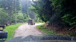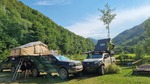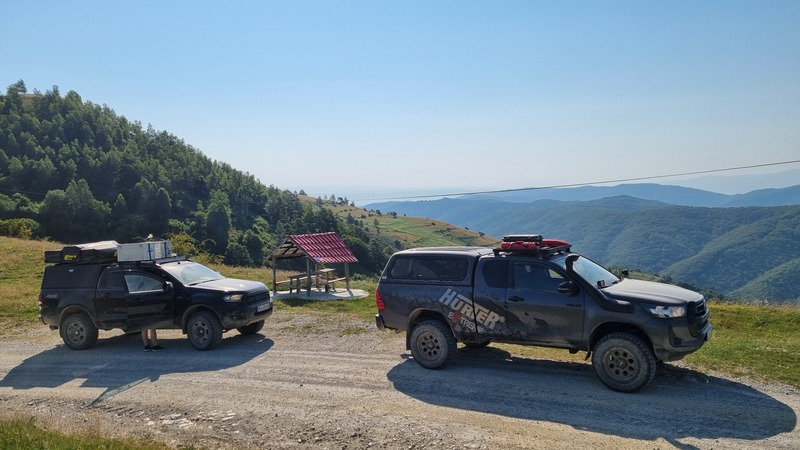 Es geht auf gut ausgebauter Straße immer weiter hinauf, mit schönen Ausblicken auf den See. Wir halten bei den Souvenirständen an und kaufen ein paar Kleinigkeiten. Ich nehme zwei Transalpina-Aufkleber mit, ein Glas Honig und eine Flasche Palinka – der etwas Deutsch sprechende Händler zeigt mir ein Bild seiner angeblichen jungen Ehefrau und verbindet das mit dem Verkauf eines Potenzmittels – keine Ahnung, was das ist, ich denke, beides sind Fakes. Wir fahren weiter, ein paar sture Esel stehen mitten auf der Straße und bewegen sich keinen Millimeter zur Seite, da ist Geduld angesagt. Fast oben auf der Paßhöhe zweigt unsere nächste Offroad-Tour ab, immer am Kamm entlang. Über 45 km lang lt. Roadbook, mit hinter jeder Kurve neuen, wunderschönen Ausblicken in die Karpaten. Ein paar 4x4 kommen uns entgegen, aber nicht viele. Einige Abstecher auf steile Hügel sind natürlich auch mit dabei, die Aufmerksamkeit erfordern, aber in der Untersetzung kein Problem für unsere Fahrzeuge darstellt. Die sehr lange Piste ist wirklich genial von den Ausblicken her. Nach ca. 30 km finden wir an der Abfahrt einen wunderschönen Platz am Waldrand, der wie geschaffen für eine Übernachtung ist. Wir bauen unser Camp auf, Marcel spannt seine Hängematte zwischen Markus Navara und meinem Hilux. Wir kochen heute gemeinsam und genießen die Ruhe dort und den wunderschönen Blick hinunter ins Tal. Ein kleines Lagerfeuerchen rundet den gelungenen Tag ab.