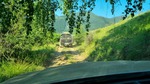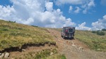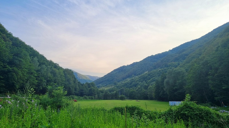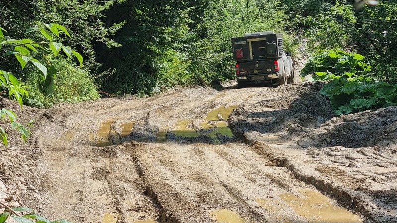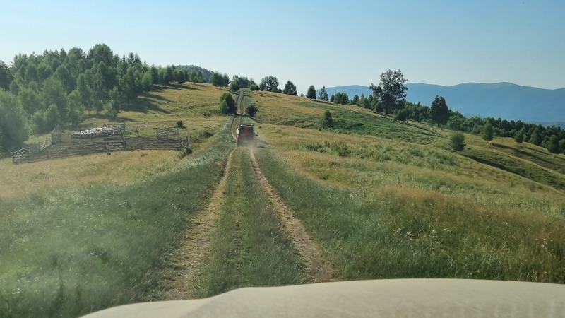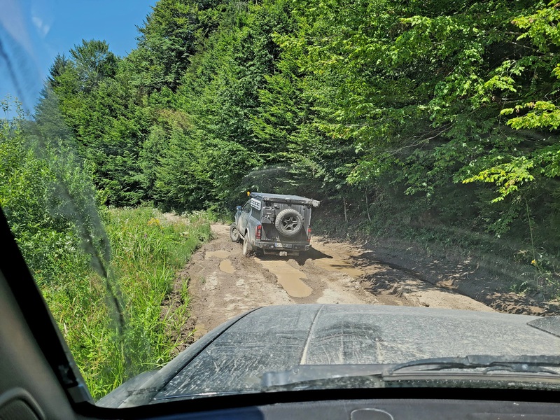 Am nächsten Tag verabschieden wir uns von Dana und Tudor und rumpeln den Weg wieder hinunter ins Tal. Natürlich nicht, ohne ein T-Shirt und einen Aufkleber vom Camp mitzunehmen! In Arieseni beginnt unsere nächste Tour. Es wird ein langer Offroad-Trip, viel Schotter, teilweise eine sehr derbe Piste. Man braucht öfter mal die Untersetzung. So rumpeln wir viele Kilometer über Berghänge, bis wir irgendwo ein Camp suchen. Oben auf dem Bergkamm wären schon gute Plätze dabei gewesen, da aber immer wieder schwarze Wolken aufziehen, entscheiden wir uns dann doch für ein Plätzchen etwas weiter unten. Wir finden einen Platz unweit der Piste, reicht gerade so für unsere Autos. Etwas weiter weg hören wir ein Gewitter, es bleibt aber trocken. Unweit unseres Stellplatzes fließt ein Bächlein vorbei. Und es bleibt ruhig, nur morgens fährt ein Auto vorbei, den unsere Anwesenheit aber nicht weiter stört. Die Bärenspuren unweit auf dem Weg sind wohl schon etwas älter, trotzdem sollte man sich bewusst sein, dass auch hier manchmal Bären unterwegs sind! Ich bin froh, nur die Spuren gesehen zu haben.
