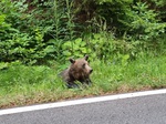 Vor 8 Jahren waren wir am anderen Ende der Transfagarasan eine Nacht im Hotel „Cumpana“. Das haben wir wieder angesteuert, liegt direkt am Stausee Lacul Vidraru. Nach ca. 5 km Schotterfahrt kommt man dort an. Es sieht noch genauso aus wie vor 8 Jahren. Leider auch innen. Inzwischen sehr in die Jahre gekommen, haben wir uns entschlossen, doch weiter zu fahren, Camping bietet er leider auch nicht mehr an. Also weiter am See und es dauert nicht lange, bis wir im Stau stehen – der Sonntagsverkehr und eine Baustelle lassen uns leider nur sehr langsam vorwärtskommen! Dafür sehen wir ungefähr 8 Braunbären direkt an der Straße! Beeindruckend, so in 2 m Entfernung dieser wunderschönen Tiere zu stehen! Ist hier wohl besonders an Sonntagen üblich, dass die Bären nah an die Straße kommen, weil sie immer wieder was zu fressen bekommen. Und das, obwohl wir sogar eine Warnung aufs Handy bekommen haben, man soll sie bitte nicht füttern, im Auto bleiben, Fenster schließen und dergleichen. Naja, manche Leute sind halt einfach unvernünftig, wie überall.