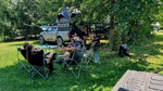 Wir erreichen das kleine Dörfchen Poiana Horea. Dort beginnt die Auffahrt zum wunderschön gelegenen Black Sheep Camp. Man durchquert einen Bach, fährt in einem anderen Bach entlang und dann geht es sehr steil bergauf – so eine Anfahrt zu einem Camp habe ich in meinem Leben noch nicht gesehen! Irgendwann steht man tatsächlich im Camp der Schwarzen Schafe. Und wird gleich vom Besitzer-Pärchen Dana und Tudor mit einem natürlich selbstgebranntem Palinka begrüßt, Markus, Mona, Max und Sandra waren hier vor zwei Jahren schon mal. Hund Bursuk und Katze Turbo gehören natürlich auch zum Camp. Nach dem Begrüßungsschnaps suchen wir uns ein Plätzchen zwischen den Bäumen, es regnet leicht. Also setzen wir uns an die überdachte Feuerstelle. Die Duschen sind etwas rustikal wie auch das WC, aber das alles passt zu der Location und funktioniert. Wir verbringen einen schönen Nachmittag und Abend im Camp. Da es abends wieder zu regnen anfängt und ein Gewitter vorbeizieht, ist die Feuerstelle ein perfekter Platz, um den Tag ausklingen zu lassen.