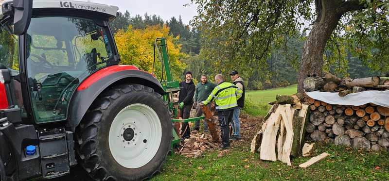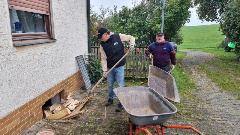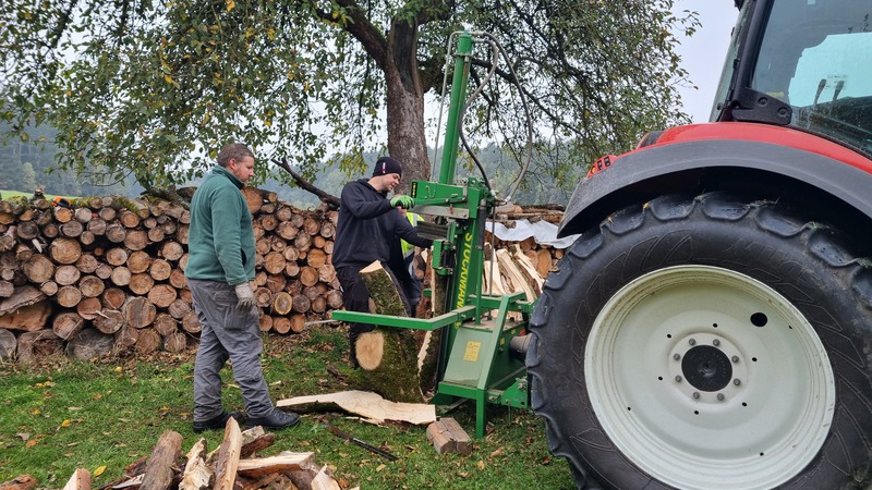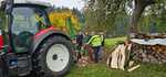 Am Samstag dann trockenes Wetter, perfekt für unsere Holzaktion! Christoph hatte den Lader und den Traktor dabei, so dass wir bestens ausgerüstet waren mit Schaufel und Spalter. Auch unsere Vermieter Renate und Justin waren dabei, dazu noch viele von unseren Jungs und Mädels, wir konnten loslegen. Max und ich haben den Keller aufgefüllt und dann gleich die Heizung gereinigt, während die Mädels einkaufen waren und gleich mit dem Gulasch für Abend angefangen haben. Der Rest war mit Sägen, spalten und anschlichten beschäftigt. Nebenbei haben Tobi, Basti und Lena mal rund um den Hof etwas ausgeastet.