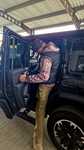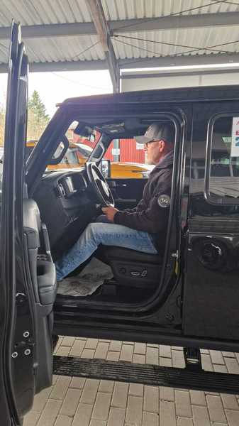 Öffnet man die Fahrertür, klappt ein Teil des Schwellers nach unten und wird zum Trittbrett. Nettes Gimmick, vor allem im Falle eines höhergelegten und mit größeren Reifen versehenen BAW – die Zubehörindustrie arbeitet schon fleissig an Zubehör. Nimmt man hinter dem Steuer Platz und blickt nach vorne, wird man erinnert an alte Jeep-Zeiten mit nach vorne zulaufender Motorhaube und kleiner Frontscheibe. Sonst ist alles sehr modern. Die Verarbeitung mit dem Leder macht auf den ersten Blick keineswegs einen billigen Eindruck, alles scheint wertig und stabil. Viele manuelle Knöpfe sind ein Segen, wenn man sich nicht erst durch drei Menüs arbeiten möchte! Der Einstieg in die zweite Reihe ist etwas eng geraten, für unseren Basti mit seinen 2 Metern lichter Höhe durchaus sportlich. Hat man die zweite Reihe erst mal erklommen, ist aber genügend Platz vorhanden, um bequem auch auf längeren Strecken sitzen zu können.