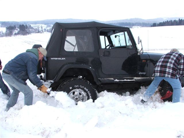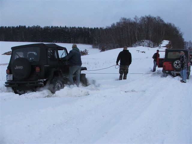 und Stefan mit seinem Wrangler voraus, da diese Fahrzeuge die größte Bodenfreiheit und die gröbste Bereifung aufwiesen. Die Fahrzeuge kämpften sich tapfer durch die Schneemassen, bis auch hier nichts