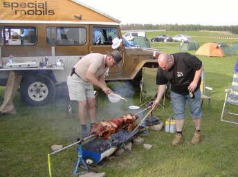 Harley-Stand, die Biker hielten es aber nicht für nötig Berge-Bier zu bezahlen. Um etwa 14.00 wurde der Grill für´s Abendessen hergerichtet. Mirco hatte ein Spanferkel von etwa 30 kg mitgebracht, daß