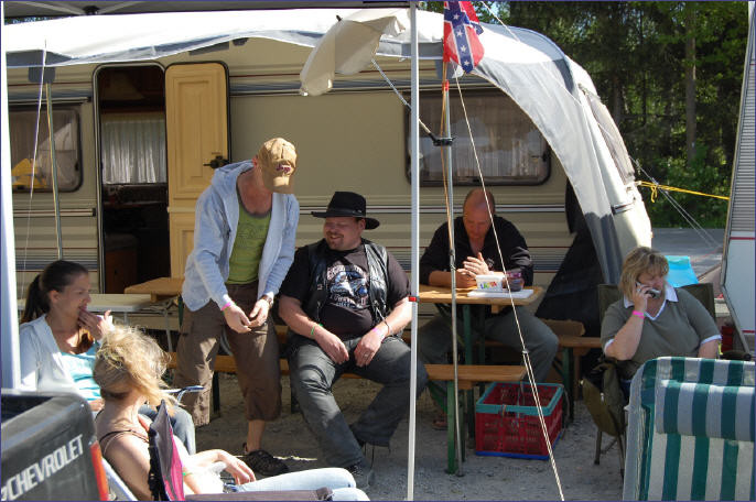 Freitag werden wir irgendwann von zunehmendem V8 – Gebollere geweckt, die ersten Teilnehmer trudeln ein. Jeannette und ich holen uns die Armbändchen und die Aufkleber für die Autos, bevor die Straße