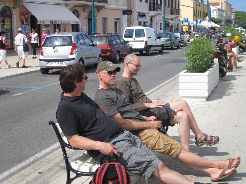 Am Sonntag weckt uns ein starker Regenguß, danach ist es wieder zeitweise sonnig. Der Markt am Campingplatz hat schon teilweise zu, rentiert sich wohl nicht mehr, extra für die paar übriggebliebenen noch aufzumachen… Also holen wir Brötchen im nahen Nerezine. Klaus schlägt vor, eine Tour in den Norden der Insel zu machen, wir sind sofort dabei. Über Vodice bis zur nördlichen Fähranlegestelle nach Porozina, auf dem Rückweg noch einen Abstecher nach Beli. Der kleine Fischerort liegt auf einem Hügel über dem Meer, der Weg dorthin ist schmal, gut, daß so wenig Gegenverkehr herrscht! Unten am schmalen Strandabschnitt ist ein kleiner Campingplatz, der von Tauchern genutzt wird und uns irgendwie an eine Hippie-Kommune der 60er Jahre erinnert! Da André den Weg gesucht hat und über Funk und Handy nicht mehr erreichbar ist, wandern Stony und ich zu Fuß den extrem steilen Fahrweg nach unten – und auch wieder hinauf! Gottseidank kommt Klaus mit dem Lux entgegen und wir quetschen uns alle in den Pickup, um unten am Strand einen Cappuccino zu schlürfen! Danach fahren wir wieder zurück zum Campingplatz. Bei einer Länge von über 70 km braucht man doch einige Zeit, bevor man wieder zurück am C-Platz ist. Als ich baden gehe, merkt man doch, daß das Wasser schon deutlich kühler geworden ist….