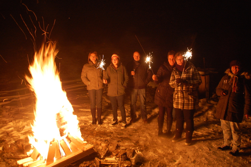 Nach dem Essen saß man entweder gemütlich in der Kaminecke oder trank was hochprozentiges an unserer Bar, die Zeit verging wie im Flug. Kare, der Jagdpächter, der mit seinem Suzuki unterwegs war, schaute auch auf ein Silvester-Weizen vorbei. Kurz vor Mitternacht machte Norbert dann ein Feuer, schnell war eine kleine Bar aufgebaut und bewaffnet mit Sekt und Gläsern konnten wir das neue Jahr begießen! Knallerei hatten wir nicht dabei, aus Rücksicht auf die 3 Hunde. Nachdem die große Umarmung vorbei war, gingen wir zurück und saßen dann doch noch bis um 3 Uhr, bis wir das Licht ausmachten!