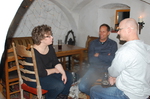 Als dann alle da waren, stachen wir vor dem Essen gleich mal das kleine Zoigl-Faß von Holger an. Ein Schlag und der Hahn saß! Leider nicht lange, irgendwie saß er wohl doch zu locker, was uns einen halben Liter Bier und ein paar vollgesaute Klamotten sowie eine kleine Bodenwischaktion kostete… Leider erwischte es auch die Linse der Kamera, ohne daß ich es bemerkt hätte und deshalb ist ein Teil der Bilder mit einem Zoigl-Fleck versehen!