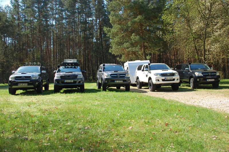 Auch am Sonntag wieder strahlender Sonnenschein, leider auch schon das letzte Frühstück. Danach heißt es alles wieder verstauen, ein Gruppenbild mit den Hiluxen muß natürlich schon mal sein, wenn schon mal 5 da sind! Nach einer herzlichen Verabschiedung macht sich jeder auf den Heimweg, Norbert folgt uns unauffällig. Und wundert sich wahrscheinlich über meinen kleinen Umweg bei der Baustelle vor Nürnberg, irgendwie war ich hin und hergerissen zwischen Navi und Straßenschildern – egal, wer schuld war, der Umweg war ca. 6-7 km lang.