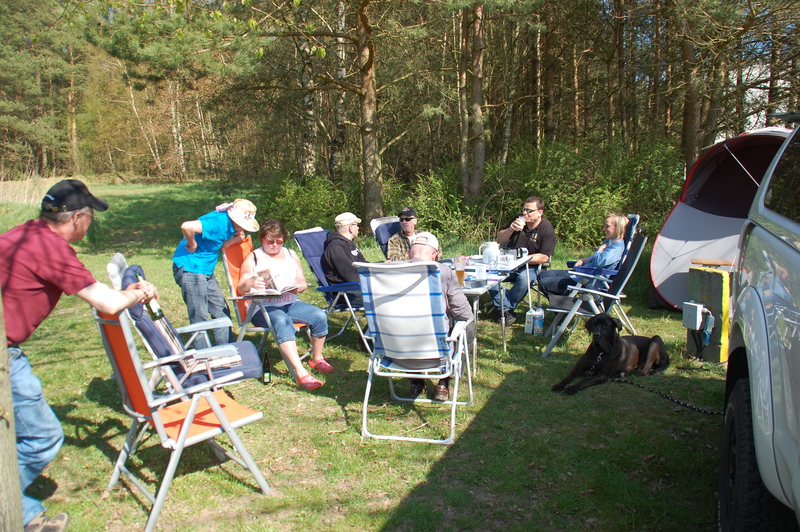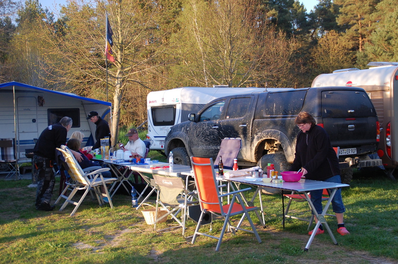 So im Laufe des Tages kommen noch viele andere Offroader an, alte Bekannte und auch wie immer ein paar neue Gesichter, so daß sich der Campground gut füllt. Nachmittag sitzen wir in der Sonne und genießen einfach das Campleben bei Kaffee und Kuchen und dem einen oder anderen Bierchen. Als letzte für heute kommen dann Holger und Katja mit ihrem Hilux und dem nagelneuen Knaus-Wohnwagen im Schlepptau. Nach über 5 Std. in einer Totalsperrung auf der Autobahn schieben wir den Wohnwagen auf ein noch freies Plätzchen und machen dann erst mal ein Bier auf! Grillen gehört natürlich immer dazu, deshalb legen wir auch abend wieder Fleisch und Würstchen auf, bevor wir alle ans große Lagerfeuer wechseln und in einer großen Runde den Abend ausklingen lassen.