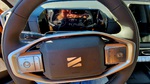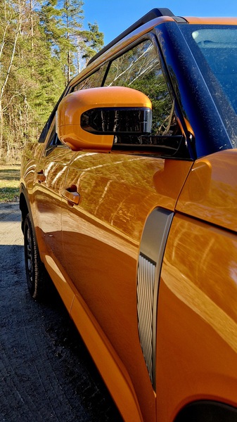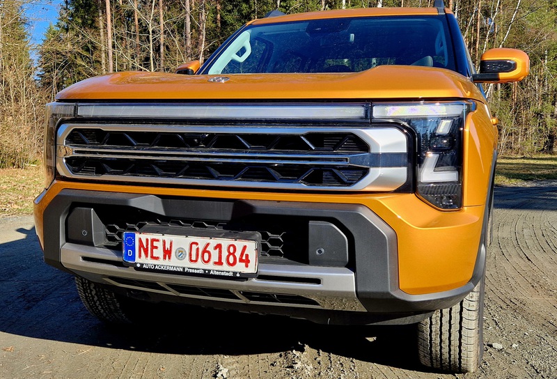 Auf einem unbefestigten Weg schalte ich am Drehhebel erst in den Allrad-Modus, dann in die Untersetzung. Das geht blitzschnell, hakelt auch nicht und funktioniert umgekehrt genauso schnell und problemlos. Angezeigt wird einem der Fahrmodus im Display, in 4L mit einem blauen Symbol. Das Fahrwerk arbeitet komfortabel, die Hinterachse hat Einzelradaufhängung. Legt man den Rückwärtsgang ein, sieht man am Display den Weg nach hinten sowie dank einer 360° - Kamera auch die unmittelbare Umgebung des Fahrzeugs. Legt man wieder die Fahrstufe „D“ ein, schaltet die Rückfahr-Kamera erst ab einer bestimmten Geschwindigkeit aus. Der Wendekreis ist erstaunlich klein.