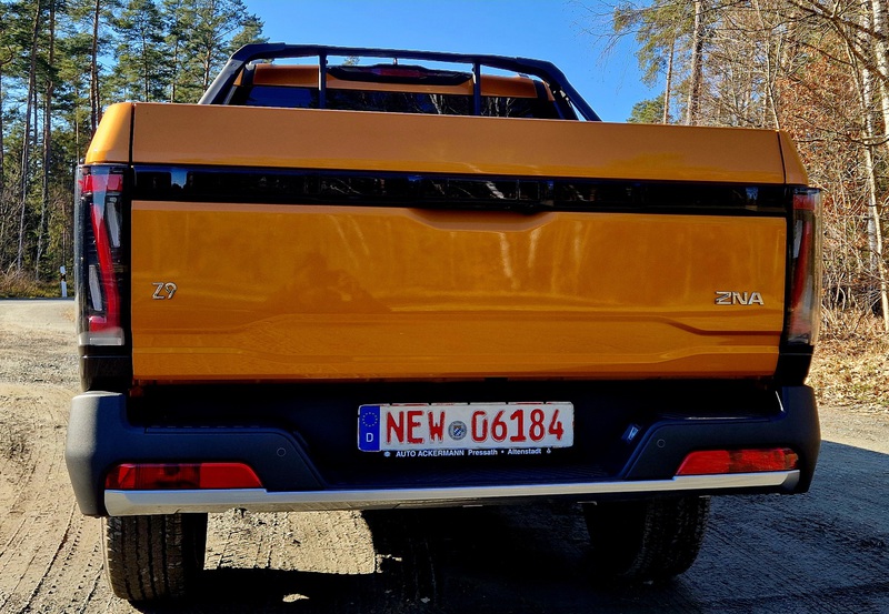 Zeit, mal auszusteigen und den Dongfeng von außen anzuschauen. Die Front ist wirklich wuchtig und modern, aber doch nicht zu zerklüftet, wie das bei einigen Mitkonkurrenten derzeit der Fall ist. Der Kühlergrill dominiert die Front, die Scheinwerfer sind stylisch und leuchten wie ein „Z“, denn der Rich 9 heißt in China Z 9. Das sieht wirklich toll aus, schaltet man das Licht ein, leuchtet auch der Mittelsteg unter der Motorhaube. Seitlich hat er eine klassische Pickup-Silhouette, wirkt nicht zu stylisch oder verspielt mit großen, glatten Flächen. Die Ladefläche ist schon etwas größer als z.B. beim Rich 6, ob einem der Bügel auf der Ladefläche gefällt, muss jeder selber entscheiden. Da wäre Raum für den Zubehörhandel! An den Heckleuchten findet sich das „Z“ wieder, gefällt mir sehr gut! Seitlich sind die Rückleuchten nur oben etwas nach vorne gezogen, ansonsten wirken sie nicht zu wuchtig.