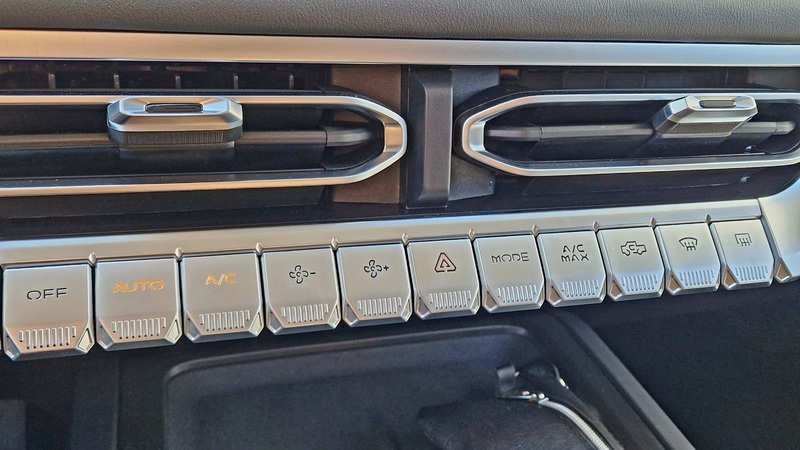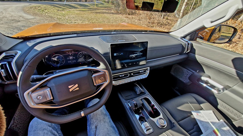 Drückt man den Startknopf, grummelt ein 2.3 Liter Diesel unter der Haube. Ein alter Bekannter aus dem Nissan Navara, hier mit 190 PS. Der Wählhebel der Automatik ist der gleiche als im Rich 6, auf „P“ Knopf drücken, für „R“, „N“ und „D“ den linken seitlich angebrachten Knopf drücken. Etwas ungewohnt, aber hat man schnell verinnerlicht. Was fällt auf? Als erstes das Raumgefühl. Und das ist wirklich sehr groß, man hat fast das Gefühl, in einem Fullsize – Pickup zu sitzen! Finde ich richtig gut, genauso wie das leicht abgeflachte Lenkrad, das einen sportlichen Eindruck macht. Das Display ist nicht zu groß und zu präsent, fügt sich gut ins Cockpit ein.