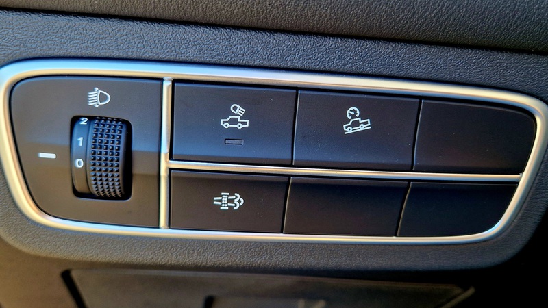 Die Sitze sind aus Kunstleder und natürlich elektrisch verstellbar. So findet man sofort eine entspannte Sitzposition. Auch auf der Rücksitzbank keine beengten Verhältnisse, der Platz ist absolut ausreichend! Auf einer Landstraße mache ich mal eine Bremsprobe, für ein Auto dieser Größe reicht die Bremskraft allemal und verzögert ausreichend schnell. Gut finde ich die Reihe von Schaltern für Klima manuell oder Automatik, Lüftung usw. So kann man ohne in ein Menü zu greifen auch alles prima von Hand mit den Tasten regulieren und einstellen! Der Motor ist beim Fahren zwar präsent, aber nicht dröhnend oder zu laut. Im Display kann man sich allerhand anzeigen lassen, Drehzahlmesser und Tacho sind nett gestaltet, nicht zu modern und gut ablesbar. Mit den Tasten im Lenkrad lässt sich auch einiges einstellen. Fensterheber und Türöffner sind griffgünstig zu erreichen.