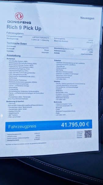 Mein Fazit fällt wirklich sehr positiv aus. Ich mag die Optik, die Abstimmung des 8-Gang-Automatikgetriebes ist besser gelungen als beim billigeren Rich 6. Der Motor ist ausreichend stark, um auch mal schneller vom Fleck zu kommen und macht durchaus Spaß! Klar, ein Sportwagen ist er nicht – aber wer so was möchte, kauft auch keinen Pickup! Das Design sagt mir persönlich sehr zu, dazu die Platzverhältnisse, die echt großzügig sind! Auch die Materialanmutung wirkt nicht billig, wie man das früher bei chinesischen Fahrzeugen hinnehmen musste - alles wirkt robust und gut eingepasst. Bestimmt werden sich einige Zubehörhändler um den Rich 9 kümmern und dann steht einer Individualisierung nichts mehr im Wege! Ich sag vielen Dank an Stefan Ackermann vom Autohaus Ackermann in Altenstadt für die Probefahrt und das angenehme „fachsimpeln“ danach! Und ich bin gespannt, wann man irgendwann den ersten Rich 9 mit Zulassung fahren sieht! (Jürgen Krauß)