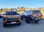 Rote Nummer deshalb, da der Rich 9 noch keine Homologation hat und noch nicht offiziell zugelassen werden darf. Was ja kein Hinderungsgrund für eine Testfahrt ist! Wenn er so neben dem Hilux steht, fällt auf, dass er erstens ganz schön groß und zweitens ganz schön hoch ist! Viel Unterschied von der serienmäßigen Höhe zu meinem höhergelegten Hilux ist auf jeden Fall nicht, auch die Länge mit über 5,50 m kann sich sehen lassen! Das ist schon ein Stückchen länger als die Midsize-Konkurrenz, ein RAM ist ca. 5,60 m. Auch ist er breiter als der Rich 6.